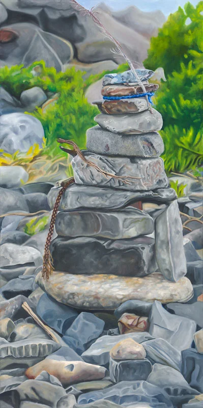 I explore notions of place and time by distilling observed land and skyscapes into oil paintings. Complementing the paintings are intimate mix media pieces constructed with copper, bones, wood, found, and crafted objects. Their themes of home and identity have a foundation in Classical and Roman Catholic mythology, literature and poetry, and the natural world.